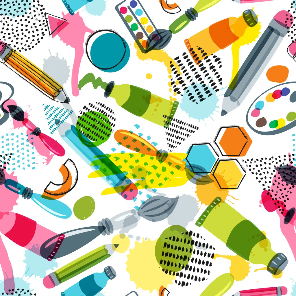 Art materials for craft design and creativity. Vector doodle seamless pattern. Creative background with pencils, brushes, watercolor paints and other items for handmade activity.